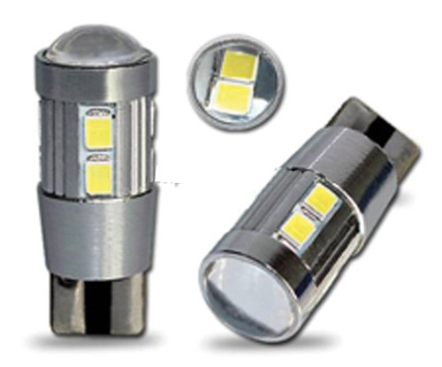 Náhradná LED žiarovka s päticou T10, 10x super svietivá SMD LED 5630 + krycia šošovka, napájacie napätie 12V, s vstavaným rezistorom (nehlási závady riadiacej jednotky na žiarovke u nových vozidiel), vhodná do parkovacích svetiel u novších vozidiel, zodpovedá žiarovke celosklo W5W . Svietivosť LED diódy je podstatne väčšia ako u žiarovky 12V 5W. Vďaka teplote svetla 6000K sú LED žiarovky ideálnym doplnkom do reflektorov s xenónovými výbojkami, kde žlté svetlo obyčajnej žiarovky pôsobí rušivo.