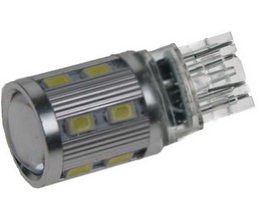 Nová generácia LED autožiaroviek s päticou T20, červená, spredu 1x super svietivý LED čip OSRAM 3W + rozptylová krycia čočka, z boku 12 SMD LED Samsung.
