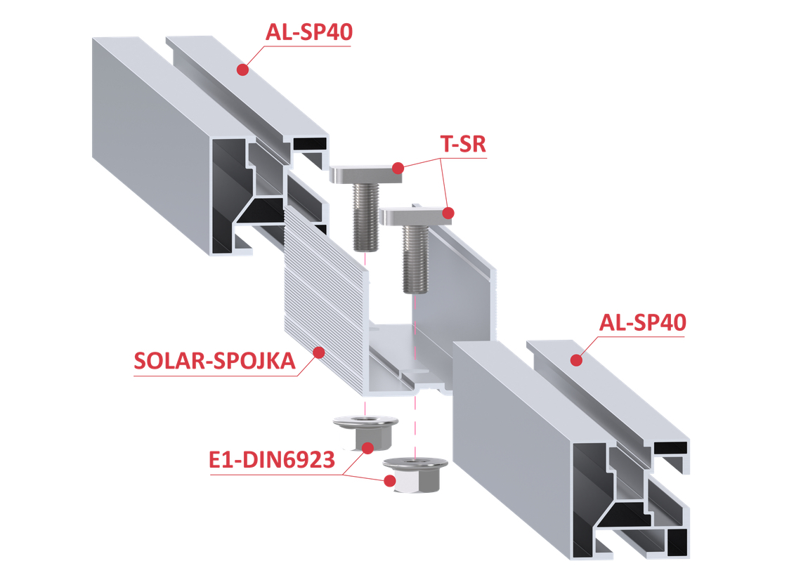 SOLAR-SPOJKA slúži na spájanie nášho hliníkového profilu AL-SP40 pri montáži konštrukcie pre solárne panely. Spájanie odporúčame podľa ilustračného obrázka nižšie.