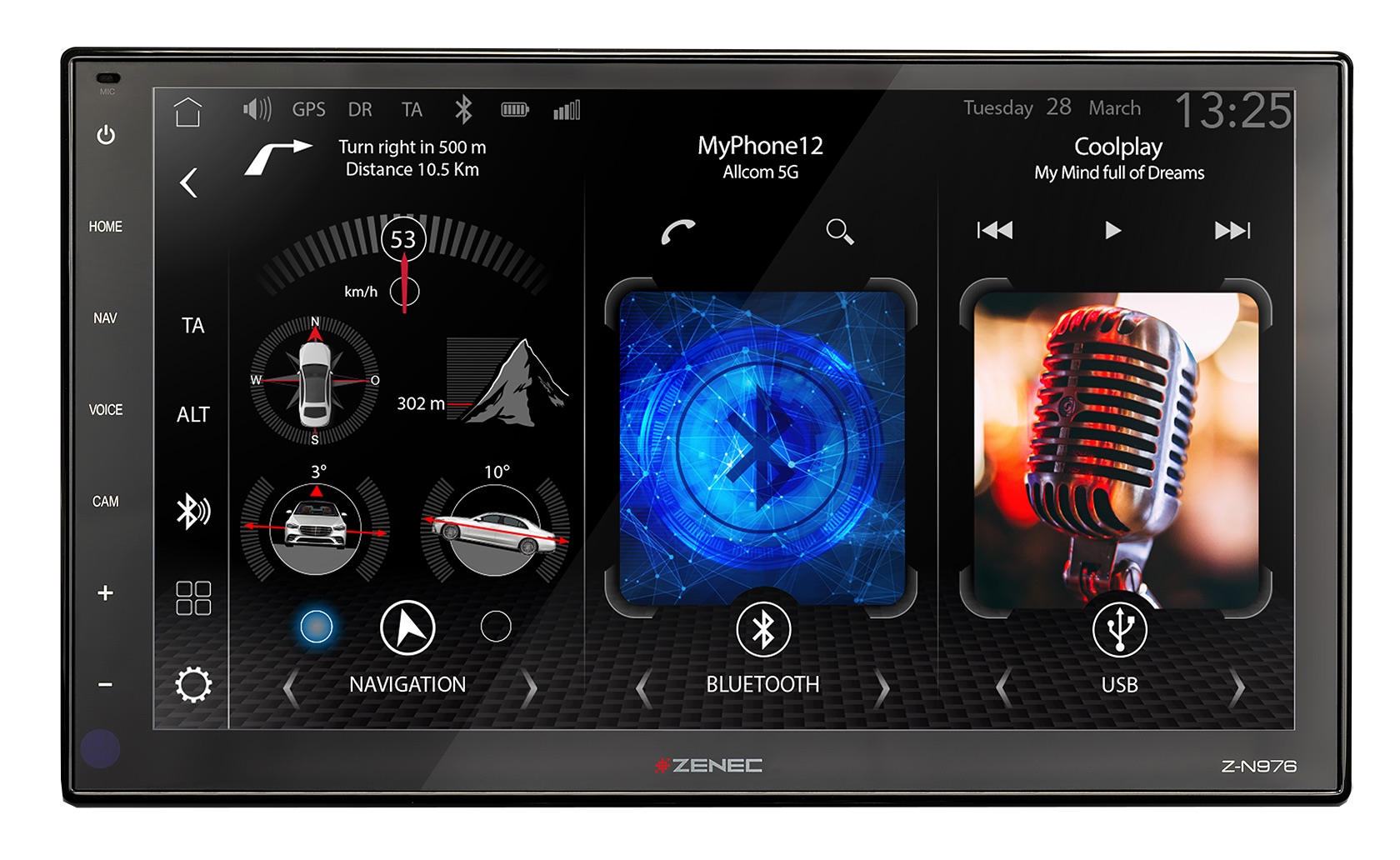 Z-N976 sa bezdrôtovo pripája k Vášmu smartfónu prostredníctvom siete WLAN. Telefonujte, navigujte alebo len počúvajte hudbu a podcasty – obzvlášť bezpečná prevádzka je zaručená. Všetky podporované funkcie je možné pohodlne ovládať prostredníctvom Apple Siri, hlasového asistenta Google alebo cez dotykový displej prístroja ZENEC. Integrovaný dvojitý tuner DAB+ s mnohými komfortnými funkciami ponúka čistý príjem digitálneho rádia vrátane dynamických zoznamov staníc, funkcie MOT Slideshow, DLS Text, DAB-FM a DAB-DAB sledovania služieb. Pre prehrávanie audia a videa je Z-N976 vybavený dvoma portami USB.