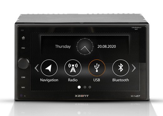 X-427 je nový 2-DIN infotainer značky XZENT do vášho auta alebo obytného vozidla: X-427 dokonale zapadne do palubnej dosky vozidiel s montážnou šachtou 2-DIN a ponúka najnovšie navigačné a zábavné funkcie. Veľký 6,5 "/ 16,5cm kapacitný dotykový displej z pravého skla umožňuje ľahké, intuitívne a úplne bezpečné ovládanie prístroja, a to aj za jazdy.