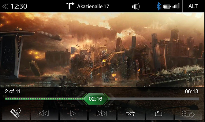 Delené obrazovka navigácie a prehrávanie zobrazuje názvy ulíc, čísla domov a informácie o ďalšom odbočení spolu s jeho aktuálne vzdialenosťou