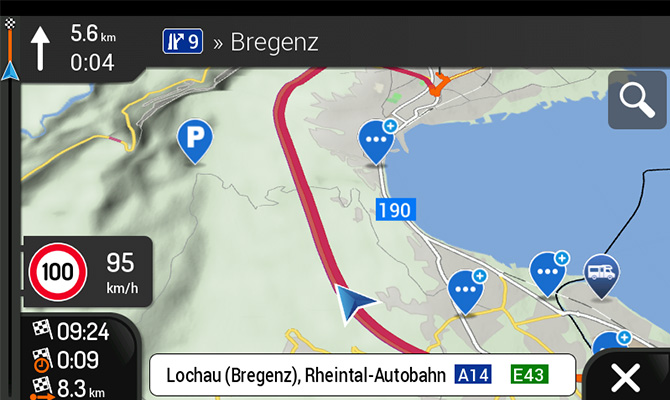 Jazda v jazdných pruhoch, režim tunela, automatický 3D zoom na križovatkách a kruhových objazdoch, inteligentný výpočet alternatívnych trás atď.