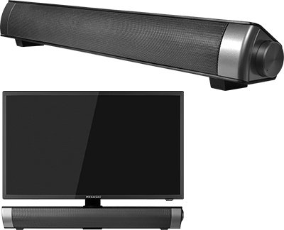 Zvuk je napájaný z USB portu televízora a zvuk je prenášaný cez konektor headsetu. Pripojenie k spodnej časti televízora sa vykonáva pomocou priloženého držáku. Širokopásmové stereo reproduktory s maximálnym výkonom 48 wattov poskytujú príjemný zvuk a nahrádzajú zabudované štandardné reproduktory televízora.
