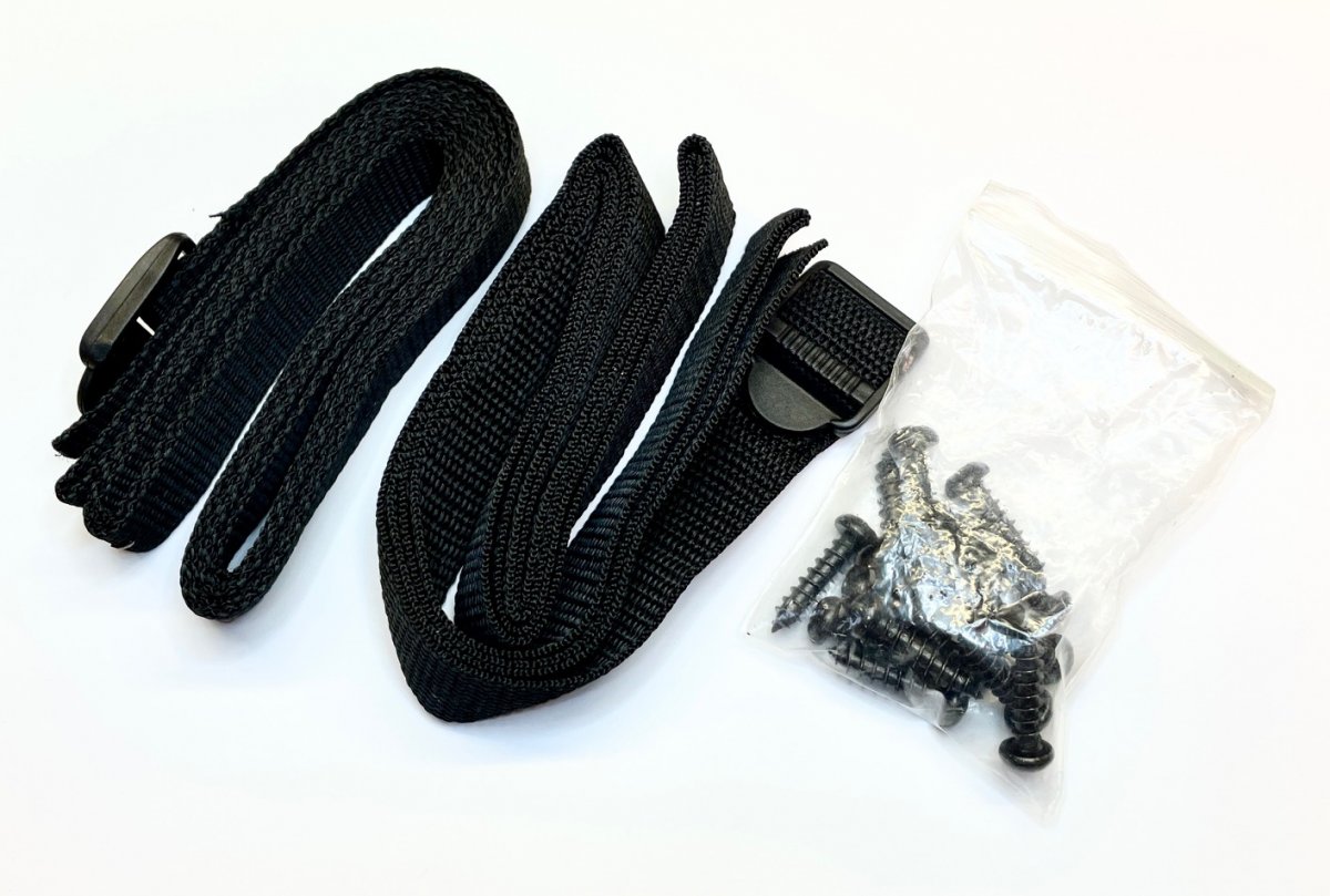 Sada obsahuje pevné upevňovacie pásy a montážne vruty, ktoré umožňujú jednoduchú inštaláciu do podlahy alebo konštrukcie kufra vozidla. Vďaka tomu je možné subwoofer stabilne upevniť bez jeho neželaného posúvania.