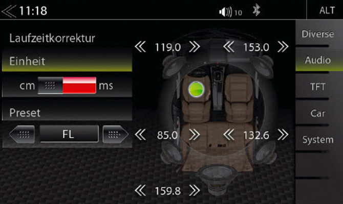 Možné je nastaviť príslušné oneskorenie buď ako vzdialenosť v centimetroch, alebo ako čas v milisekundách. S pomocou grafického 10-pásmového ekvalizéra môžete manuálne optimalizovať zvuk tak, aby vyhovoval osobitostiam vášho vozidla alebo jednoducho vašim preferenciám. Impozantný zoznam zvukových funkcií je doplnený aktívnym crossoverom s vysoko a nízkofrekvenčnými filtrami.