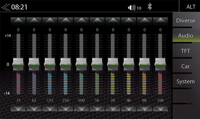 10-pásmový grafický ekvalizér umožňuje manuálne ladenie zvuku presne podľa charakteristík vášho vozidla alebo vašich osobných preferencií. Zároveň môžete vybrať preddefinovaný profil ekvalizéra zo zoznamu dostupných možností.