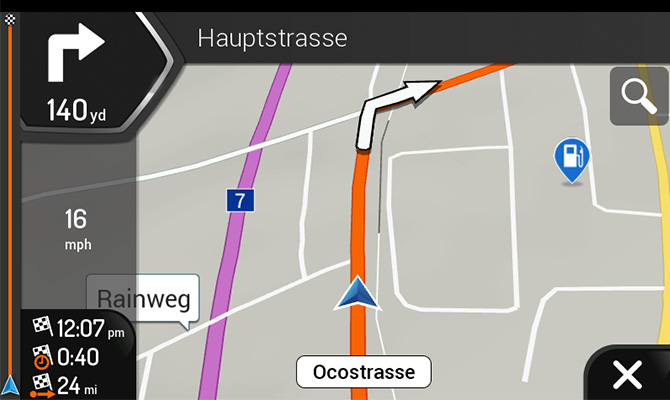 Delené obrazovka navigácie a prehrávanie zobrazuje názvy ulíc, čísla domov a informácie o ďalšom odbočení spolu s jeho aktuálne vzdialenosťou