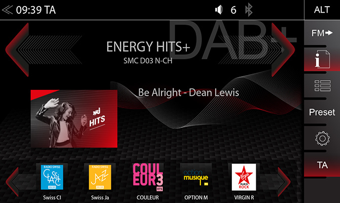• DAB+ dvojitý tuner s dynamickým zoznamom staníc, DAB<>FM a DAB<>DAB Service Following, MOT prezentácia a DLS-text