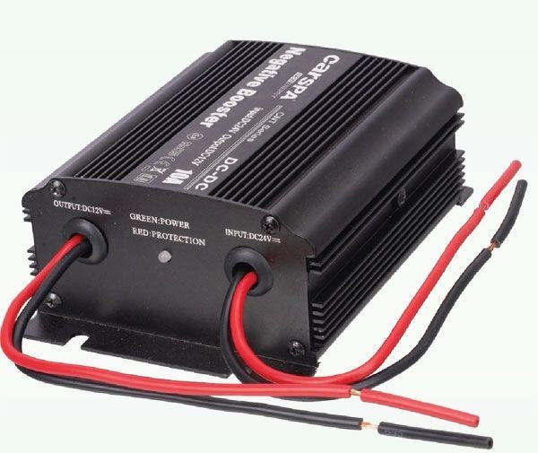 Spínaný zdroj 24VDC/12VDC zaistí prevádzku 12V spotrebičov z batérie 24V s účinnosťou cca 90%.