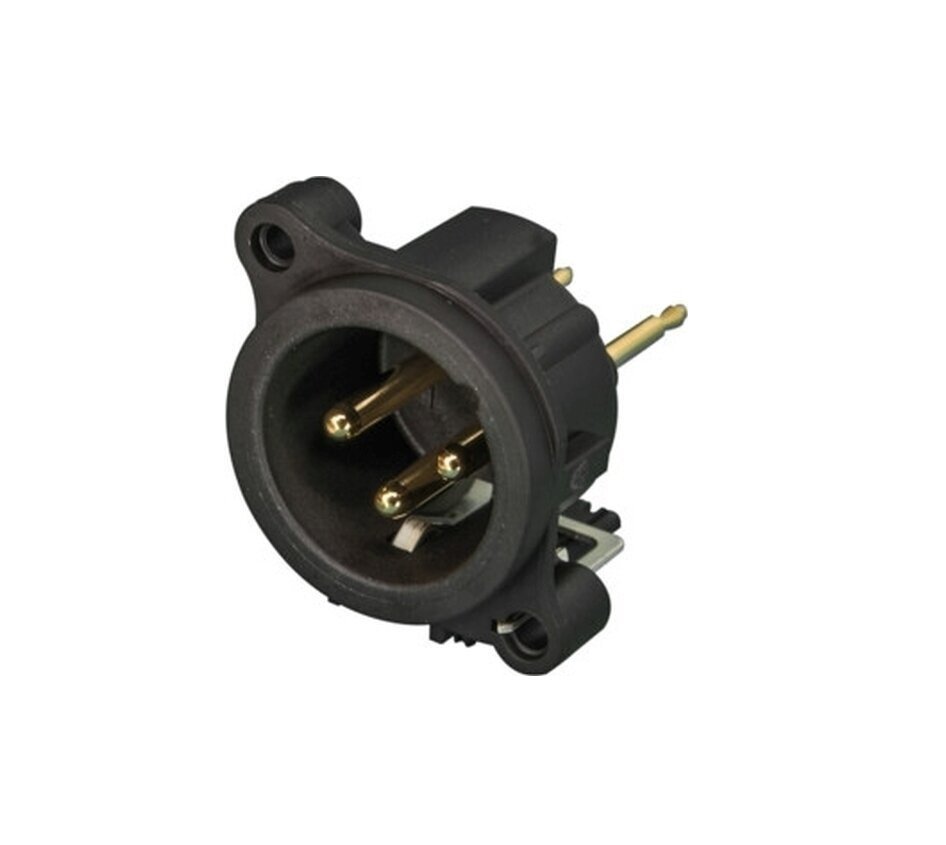 Okrúhle plastové telo XLR PCB konektora do panelu. Majú najmenšiu veľkosť a najvyššiu hustotu (23 mm medzi stredmi). Tvrdé pozlátené kontakty s leštenými kontaktnými plochami. 3-pólová zástrčka XLR samec, uzemnenie: samostatný uzemňovací kontakt na kryt konektora a predný panel, vertikálna montáž na PCB.