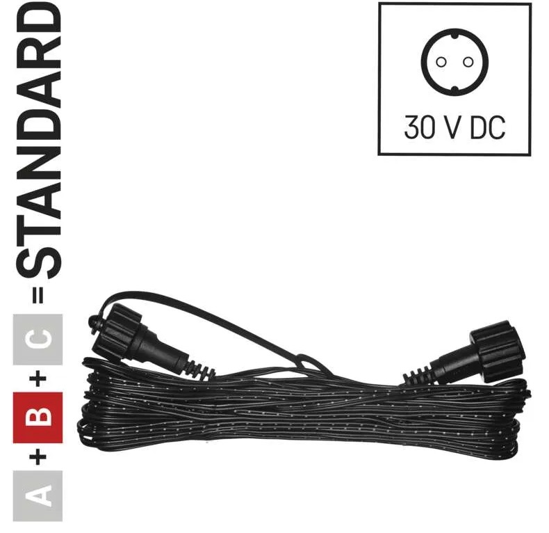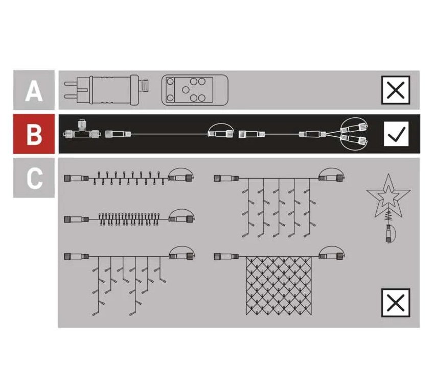 Či už ide o vianočnú výzdobu domu alebo vytvorenie čarovnej atmosféry na svadbách a večierkoch. Spojovacie svietidlá CONNECT SYSTEM vo verziách STANDARD a PROFI ponúkajú nekonečné možnosti zdobenia. Základnými prvkami sú napájacie zdroje (A), predlžovacie káble a rozbočovače (B) a osvetľovacie prvky (C), ktoré možno vzájomne prepojiť a kombinovať. Tento typ osvetlenia je ideálnou voľbou pre veľkolepé vonkajšie dekorácie, kde bežné dĺžky reťazí nepostačujú.