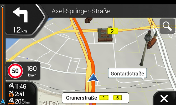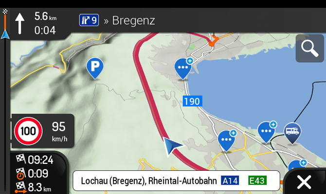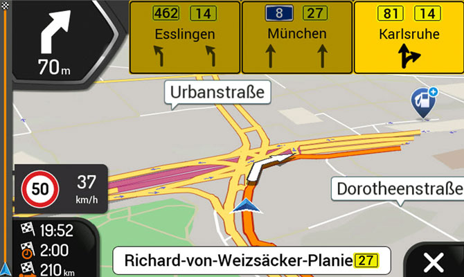 Jazda v jazdných pruhoch, režim tunela, automatický 3D zoom na križovatkách a kruhových objazdoch, inteligentný výpočet alternatívnych trás atď.