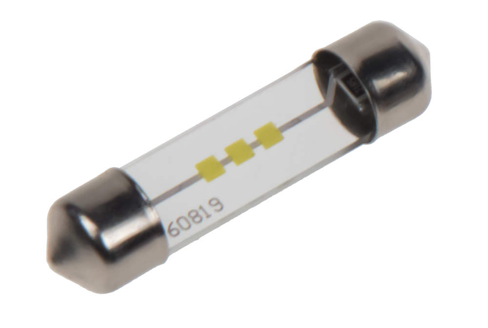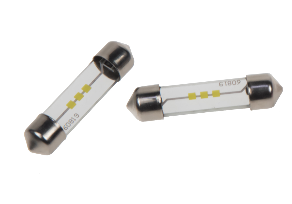 Náhradná LED žiarovka s päticou SUFIT, 3x LED typu CSP, vhodná do parkovacích svetiel u novších vozidiel. Špeciálna technológia umiestnenie LED čipov na sklenenej doske zaisťuje nižšie zahrievanie a vyššiu spoľahlivosť. Táto technológia umiestnenie LED tiež slúži na simuláciu vlákna v halogénových žiarovo - vytváranie tesne prispôsobeného štýlu lúča. Vďaka teplote svetla 6000 K sú LED žiarovky ideálnym doplnkom do reflektorov s xenónovými výbojkami, kde žlté svetlo obyčajnej žiarovky pôsobí rušivo.
