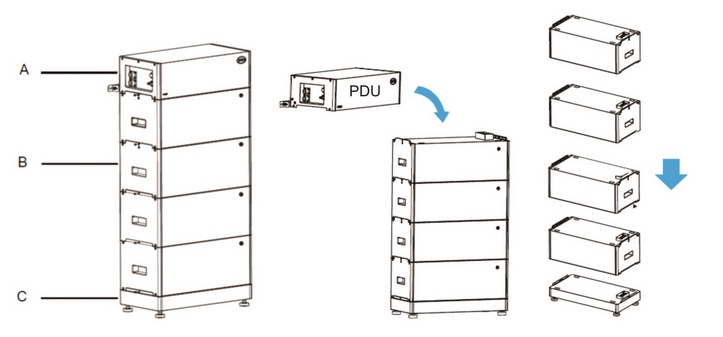 A: PDU pripojovací modul, B: LVS 4kWh modul, C. Základňa s nožičkami