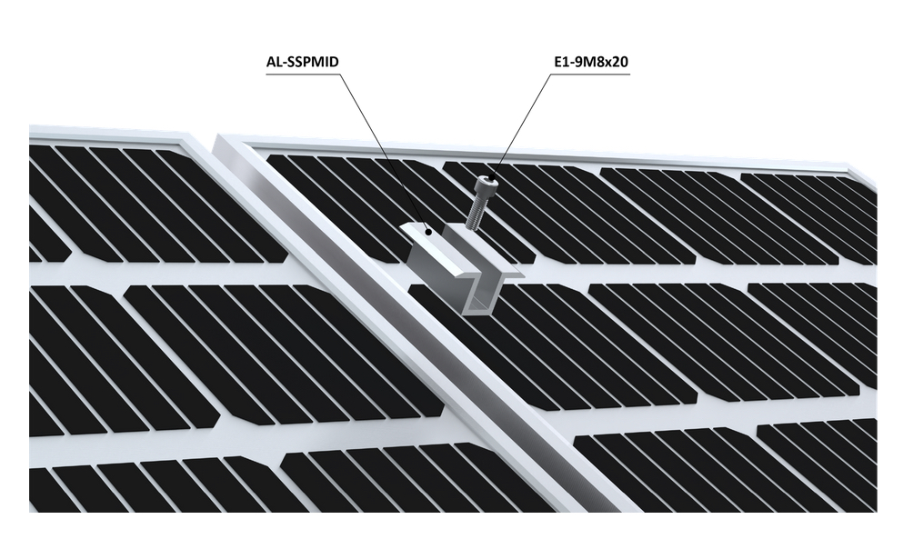 Pre spojenie solárnych panelov medzi sebou odporúčame použiť stredovu svorku AL-SSPMID. Na uchytenie svoriek do profilu AL-SP40 su vhodné nerezové imbusové skrutky E1-9M8x20 alebo E1-9M8x25 v kombinácii s nerezovou maticou E1-DIN557M8.