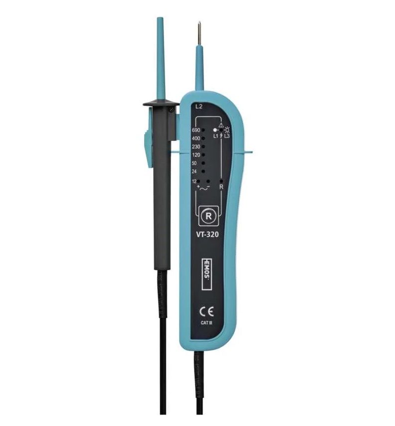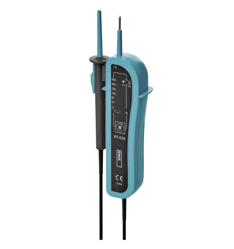 Skúšačka VT-320 je určená ku dvojpólovému meraniu veľkosti jednosmerného a strie-davého napätia od 12 V do 690 V s frekvenciou 0–60 Hz, na určenie fázového vodiča, poradie fáz trojfázovej sústavy s nulovým vodičom, určenie polarity jednosmerného napätia, testovanie kontinuity.Skúšačka vyhovuje norme EN 61243-3:2015.S touto skúšačkou môžete vykonávať meranie v elektrických inštaláciách a zariadeniach, ktoré zodpovedajú prepäťovej kategórii CAT III 690 V.Kategória CAT III je určená na meranie obvodov z vybavenia napájaného pevnou inštaláciou; ako relé, zásuvky, rozvodné panely, napájacie a krátke vetviace obvody a osvetľovacie systémy vo veľkých budovách.Nepoužívajte pre vyššie kategórie CAT.