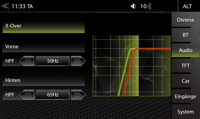 Na pripojenie externého zosilňovača cez RCA linkový výstup a pre predné a zadné reproduktory v spolupráci s interným zosilňovačom prístroja: aktívny high-pass filter 12 dB / oct. (OFF / 50 Hz / 65 Hz / 80 Hz / 100 Hz / 125 Hz / 160 Hz) zaisťuje čistý prenos do subwoofera alebo odstraňuje basové frekvencie z hlavných reproduktorov.