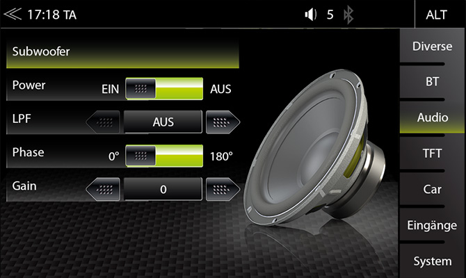Pomocou menu nastavenia subwoofera možno do konceptu systému integrovať pasívne subwoofery kombinované so zosilňovačom alebo aktívne subwoofery. Medzi ďalšie možnosti nastavenia patrí low-pass filter so strmosťou 12 dB / oct. pôsobiace na RCA linkový výstup subwoofera (OFF, 65 Hz, 80 Hz, 100 Hz, 125 Hz, 160 Hz), nastaviteľný zisk od -6 dB do +6 dB a spínateľné fázy (0 ° / 180 °).