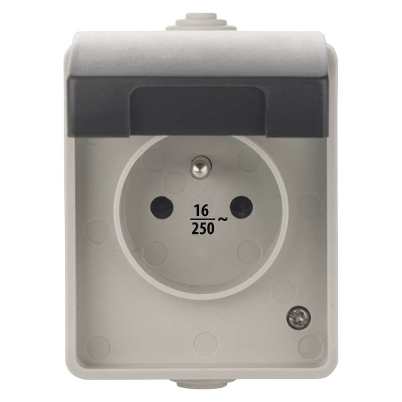 Kvalitná nástenná vodeodolná FRENCH zásuvka s ochranným viečkom.