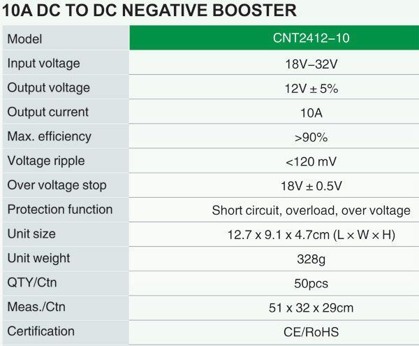 Spínaný zdroj 24VDC/12VDC zaistí prevádzku 12V spotrebičov z batérie 24V s účinnosťou cca 90%.